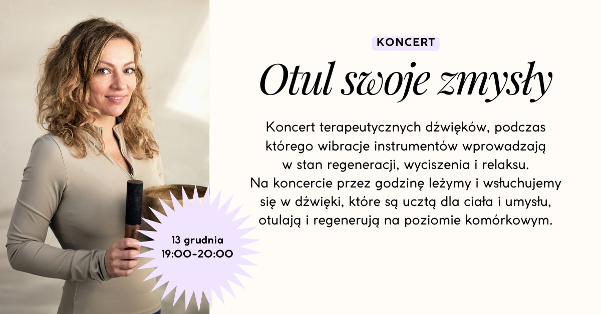 Otul swoje zmysły Zapraszamy na koncert terapeutycznych dźwięków pt. „Otul swoje zmysły”, gdzie wysokie wibracje instrumentów (gong, misy, harfa kryształowa, tunk drum i inne) wprowadzą Cię w stan regeneracji, wyciszenia, relaksu i harmonii. Na koncercie ...